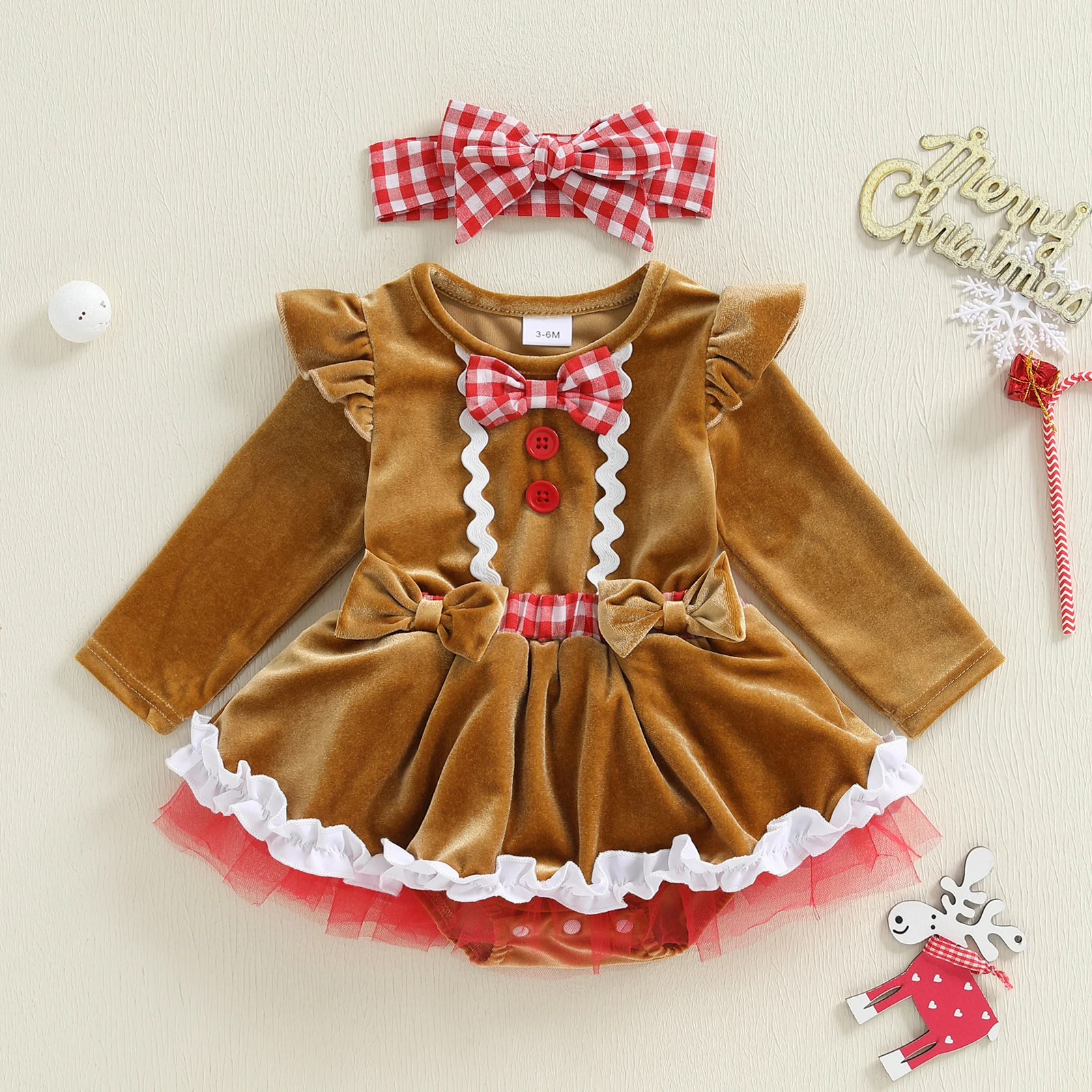 Roupa de Natal para bebês meninas homem de gengibre manga comprida macacão vestido arco bandana conjunto de 2 peças